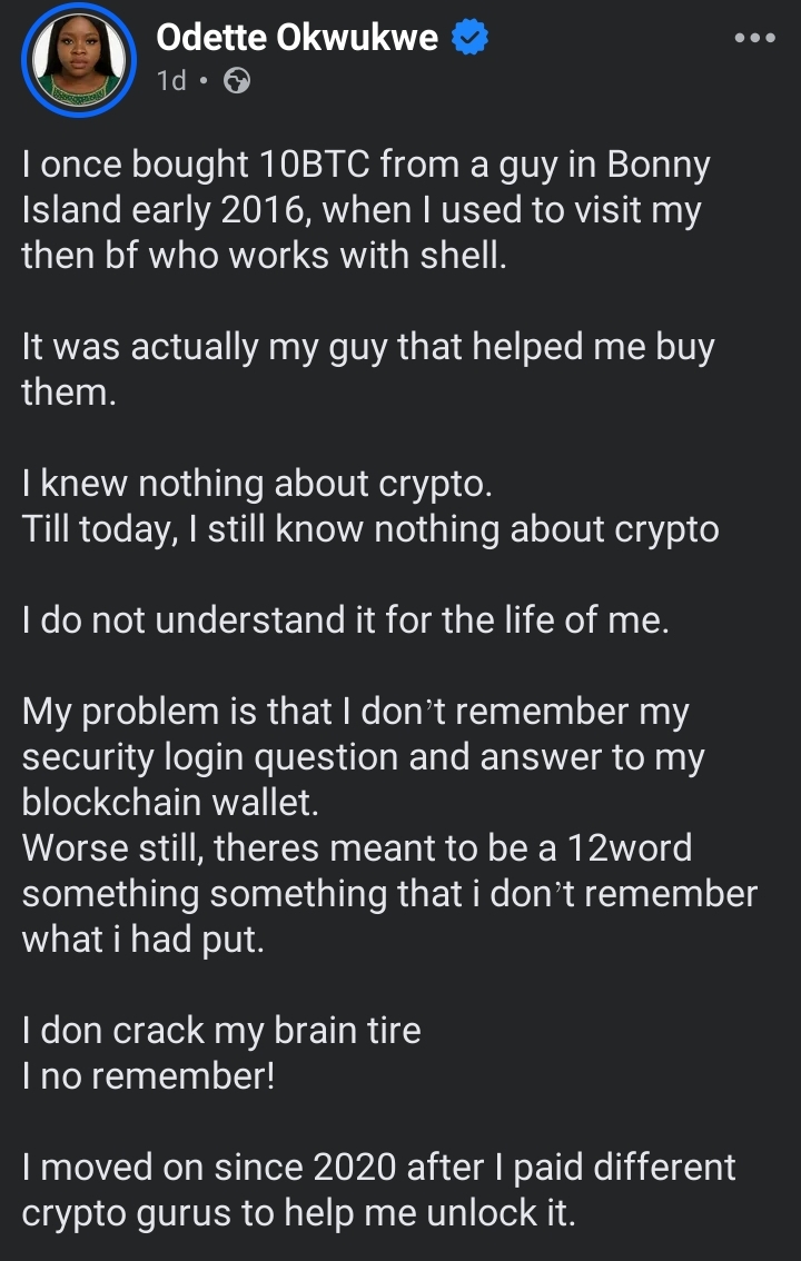 According to Odette Okwuke, as of now, she knows nothing about crypto and can’t recall the security question and answer for her Blockchain wallet.