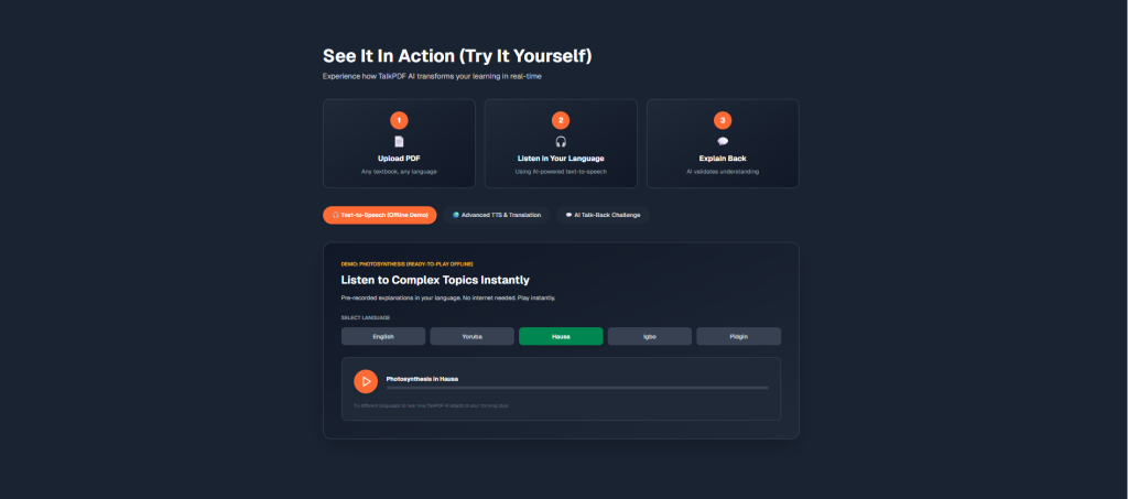 That moment shaped Abimbola’s core insight: that many students fail because they are forced to learn complex ideas in a second language, with no way to validate whether they truly understand what they’ve studied. To solve this language-induced learning crisis, TalkPDF AI converts textbooks and PDFs into an interactive audio tutor in English, Yoruba, Hausa, Igbo, and Pidgin. A student uploads a text-based study material, and the system instantly converts it into natural-sounding audio in the learner’s preferred language.