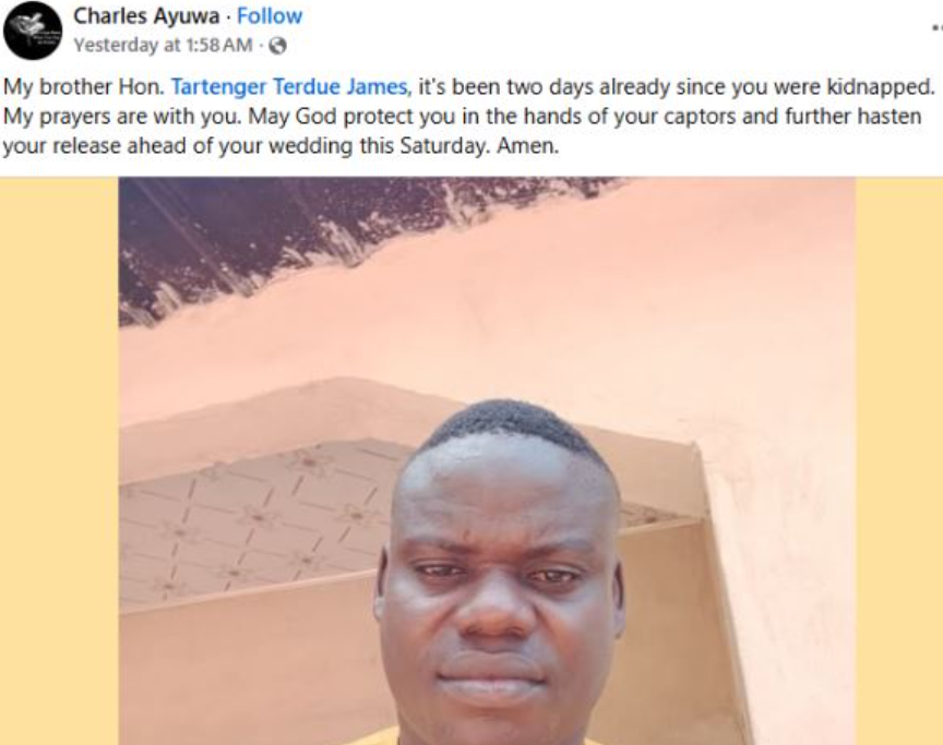 A relative, Charles Ayuwa, confirmed the incident in a Facebook post on Thursday, writing, “My brother Hon. Tartenger Terdue James, it’s been two days already since you were kidnapped… May God protect you in the hands of your captors and further hasten your release ahead of your wedding this Saturday. Amen,”.