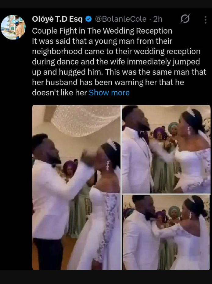 Drama as bride hugs male guest, groom loses temper at wedding reception