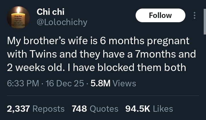 In a post on X (formerly Twitter), the lady, identified as Lolochichy, explained that her brother’s wife, who already has a seven-month-and-two-week-old child, is expecting twins. She confirmed that she has blocked both of them.