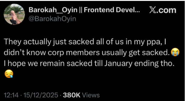 The corps member, identified on X as @barokahoyin, revealed that she did not even know it was possible for corps members to be sacked from their PPA.