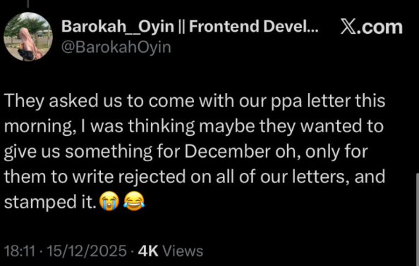 The lady, identified on X as @barokahoyin, revealed that the organization asked them to report to the office with their PPA letters. Expecting a festive gesture, she was stunned when they were all rejected instead.