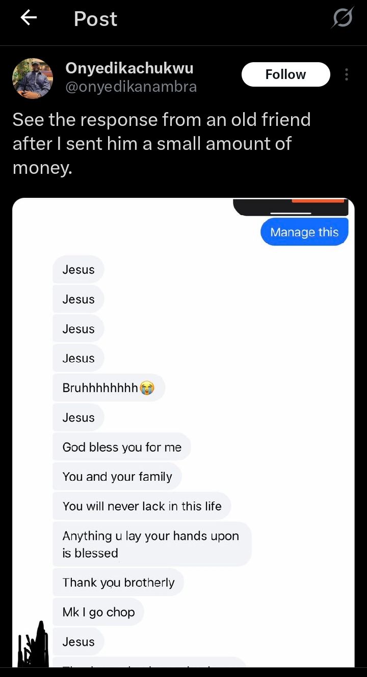 The man identified by the X handle, @onyedikaanambra shared a credit transaction with his friend, whose reaction to the message has gone viral online.