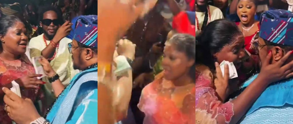 A viral clip from the premiere of Toyin Abraham’s movie, Oversabi Aunty, shows actor Mike Ezuruonye rubbing bundles of money over her head three times.