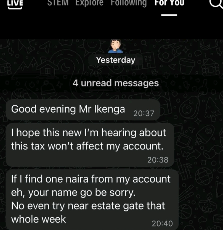 The message read: “Good evening Mr Ikenga, I hope this new I’m hearing about this tax won’t affect my account. If I find one naira from my account eh, your name go be sorry. No even try near estate gate that whole week. Thank you.”