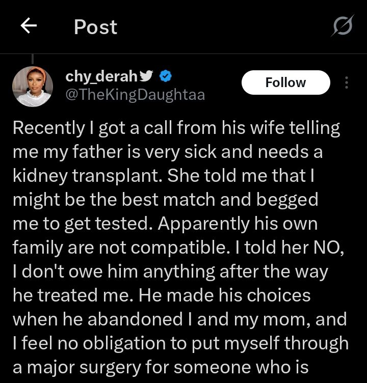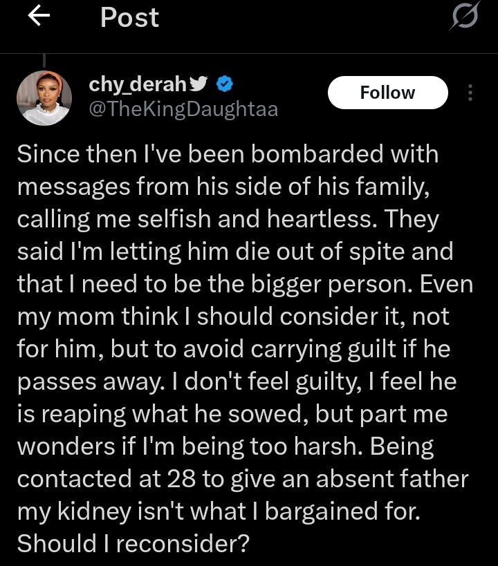 A Nigerian lady has ignited widespread debate on social media after revealing her reaction to a request for a kidney transplant test involving her estranged father.
