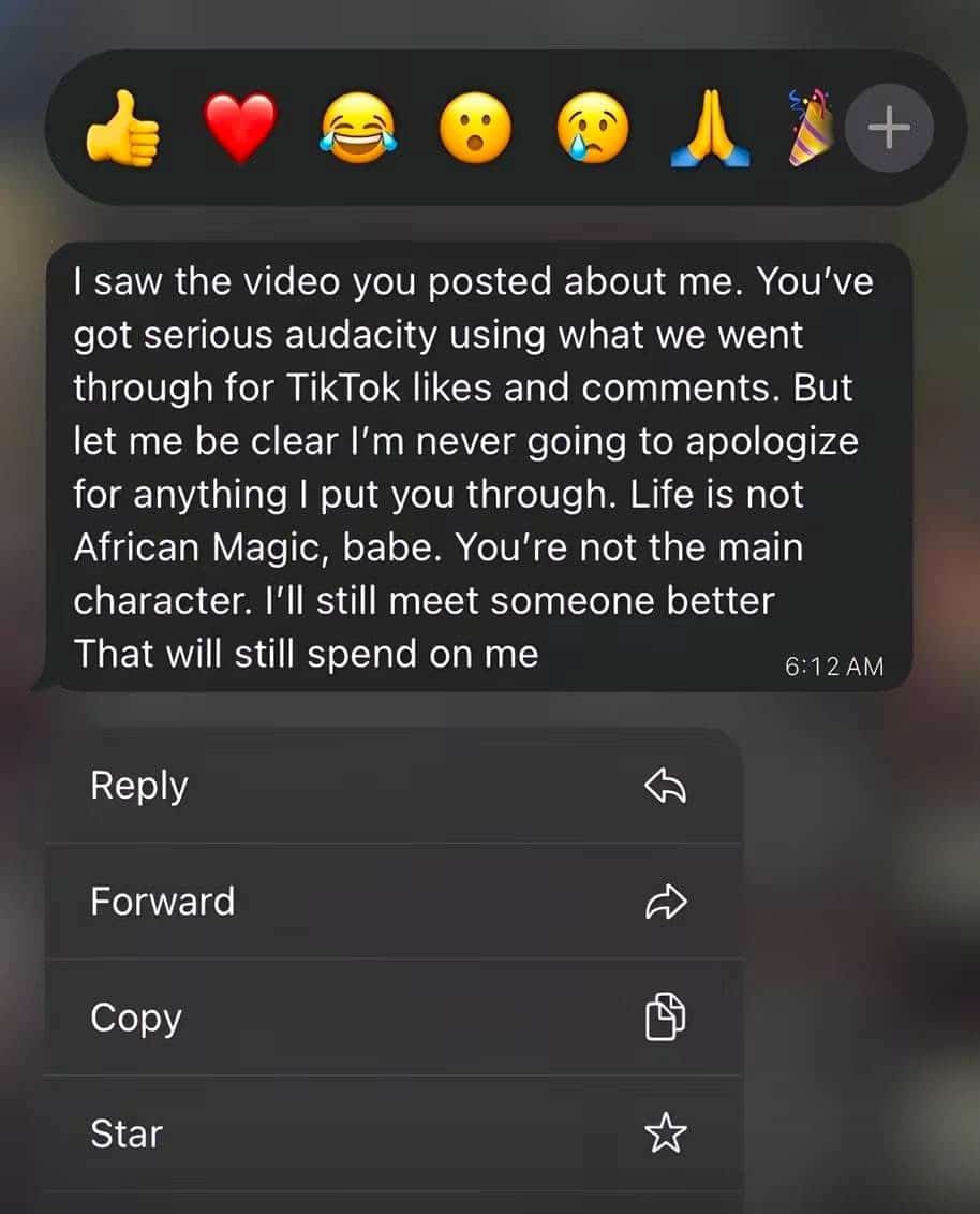 In the text, that has left social media buzzing, the man, who remains unidentified, vowed not to apologize to his ex-girlfriend for what he had put her through.