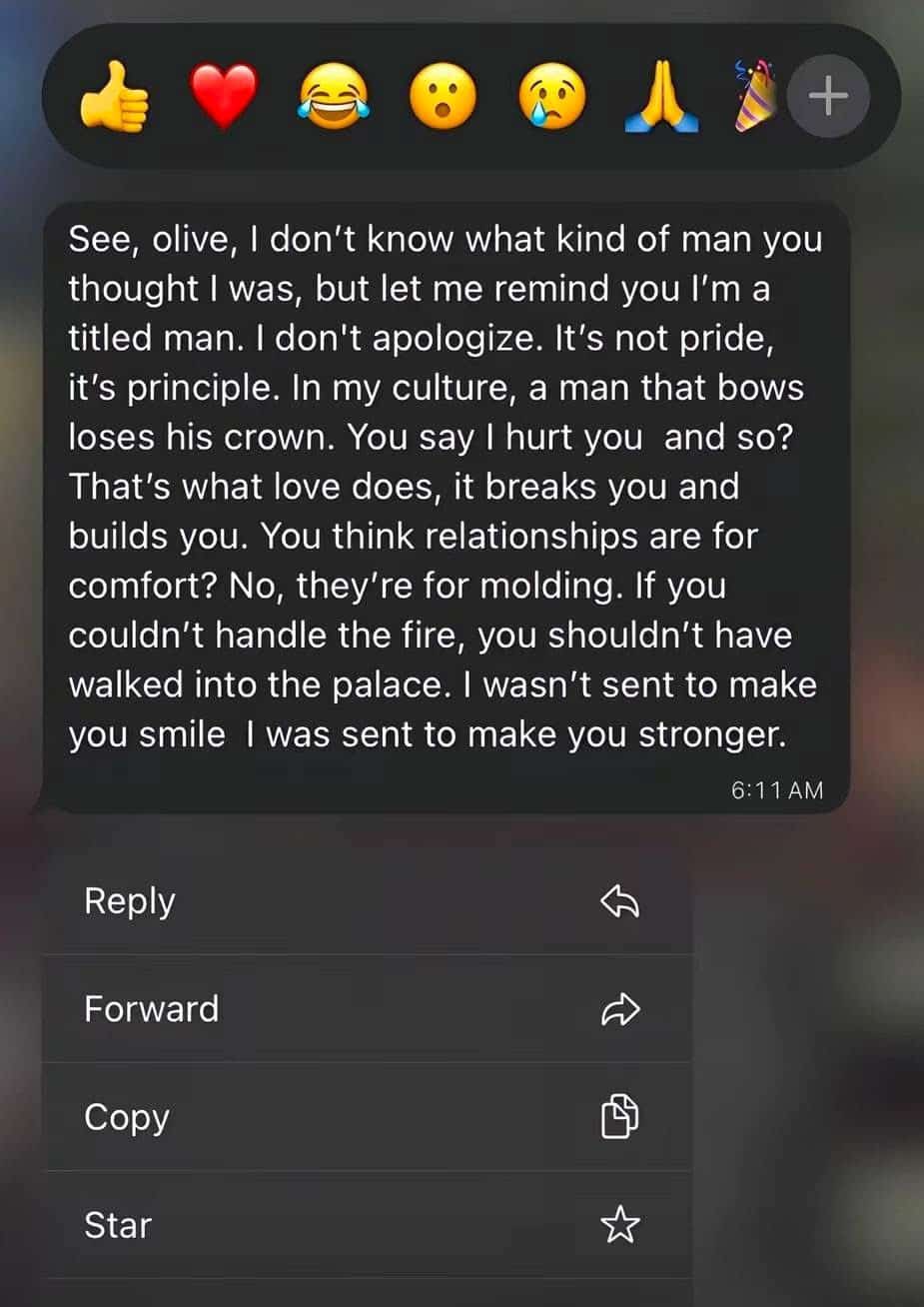 “You think relationship are for comfort?. No, they are for molding. If you couldn’t handle the fire, you shouldn’t have walked into the palace. I wasn’t sent to make you smile, I was sent to make you stronger”, He added.