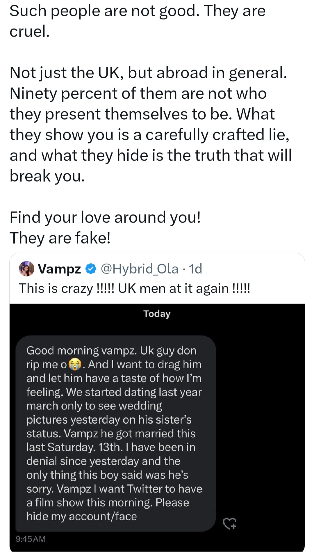 The marriage he hid from me, the life he lied about, is now scattered. And I have many stories like this, because I was foolish also to believe in love without questioning lies. Men will swear they are single, only for you to later discover the truth one way or another. Either they are in a relationship, or they are married, or they are living a double life.