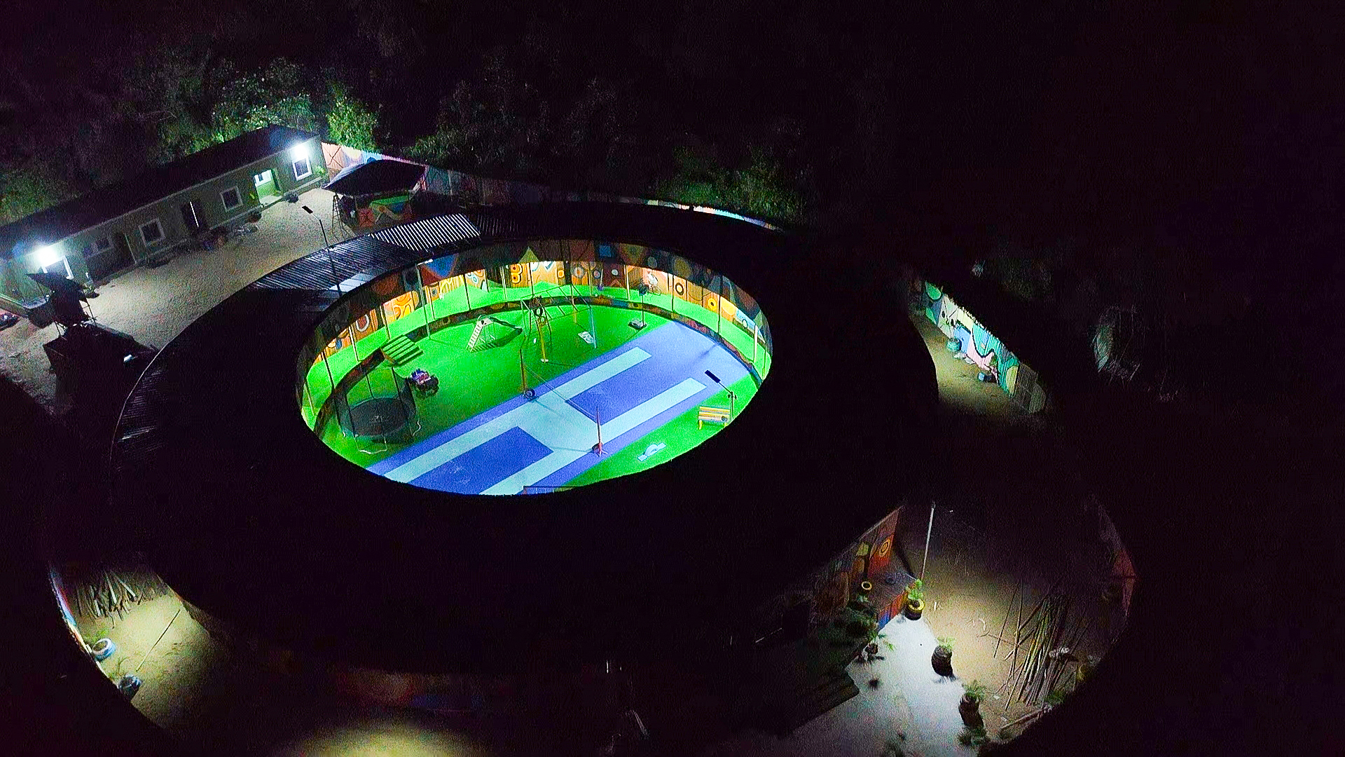Aerial view of the Slum2School Green Academy at night showing the solar-powered campus