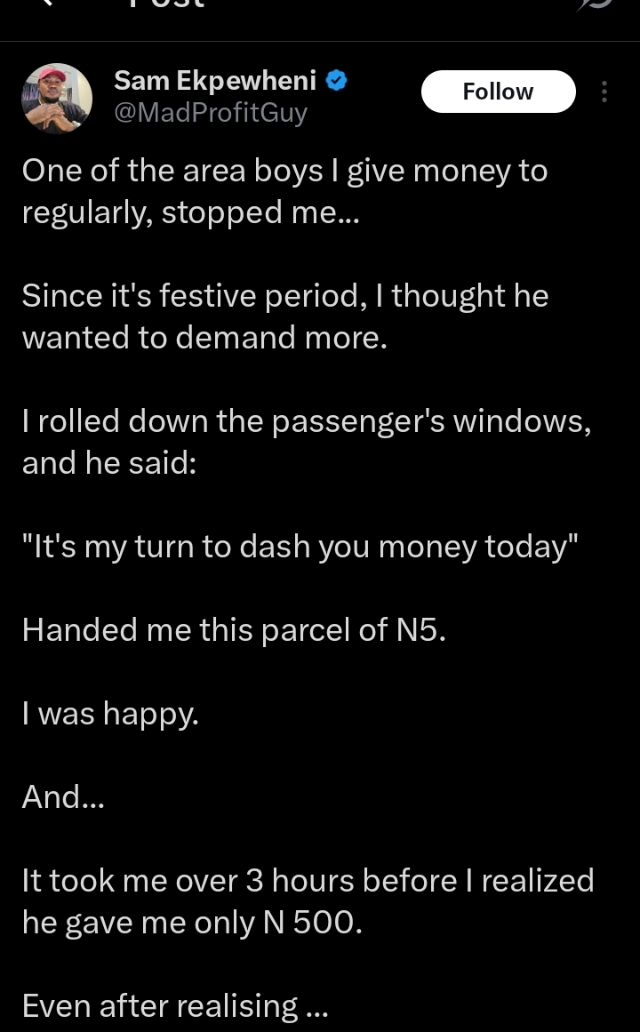 The man, identified as @madprofitguy on X (formerly Twitter), shared that he has been regularly giving the area boy money.