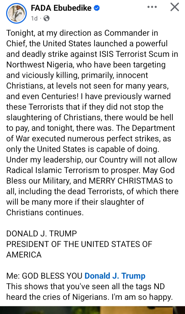 Reacting hours after the development, the Catholic priest, identified on Facebook as FADA Ebubedike, reposted Trump’s announcement of the airstrikes and commented on its broader implications.