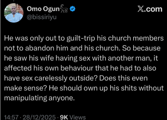 An X user, @bissiriyu, gained significant traction for his blunt critique of the pastor’s defense. He specifically addressed the cleric’s attempt to link his alleged indiscretions to past marital trauma.