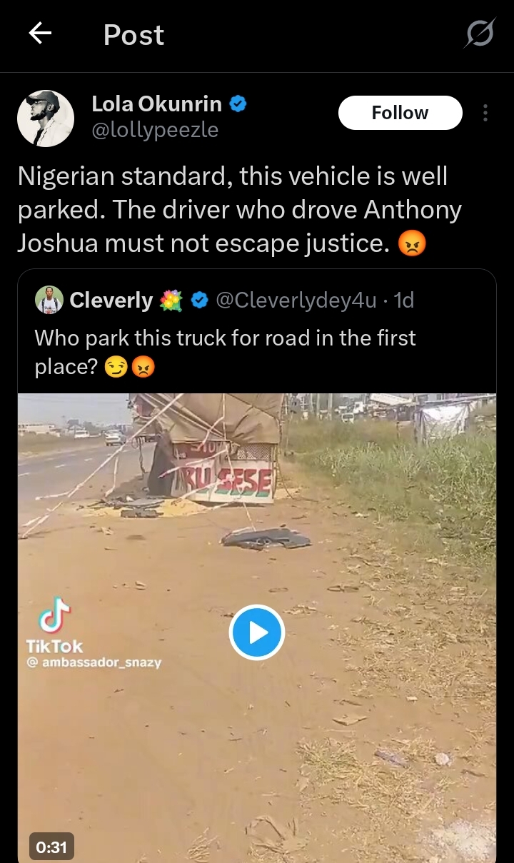 The man with the X handle, @lollypezzle reposted a video of the tragic incident, emphasizing that Anthony Joshua’s driver shouldn’t escape justice.