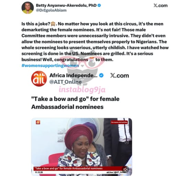 Posting on X.com, Dr. Akeredolu expressed her strong disapproval of the process, asking, “Is this a joke?”. She argued that the method is “demarketing the female nominees” and is not fair.