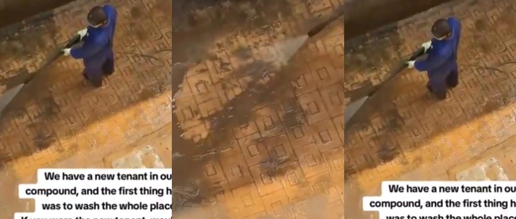 - A video circulating on X (formerly Twitter) has drawn widespread attention after a newly moved-in tenant was seen thoroughly washing the entire compound of his new residence on his very first day.