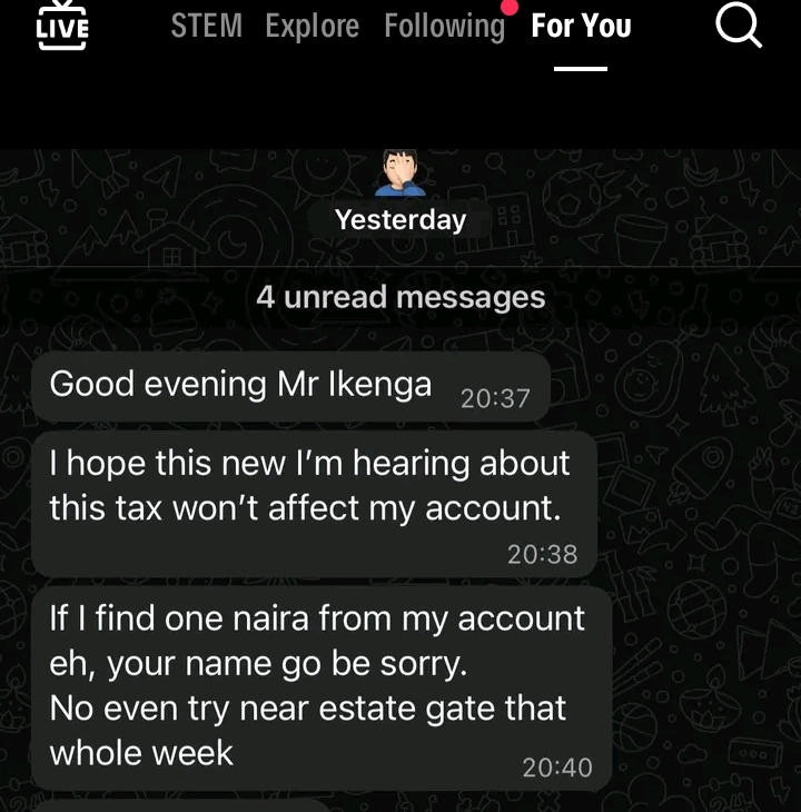 The screenshot shared by the banker, identified on TikTok as @ikenga,showed the customer’s warning to bank staff ahead of the tax reform.